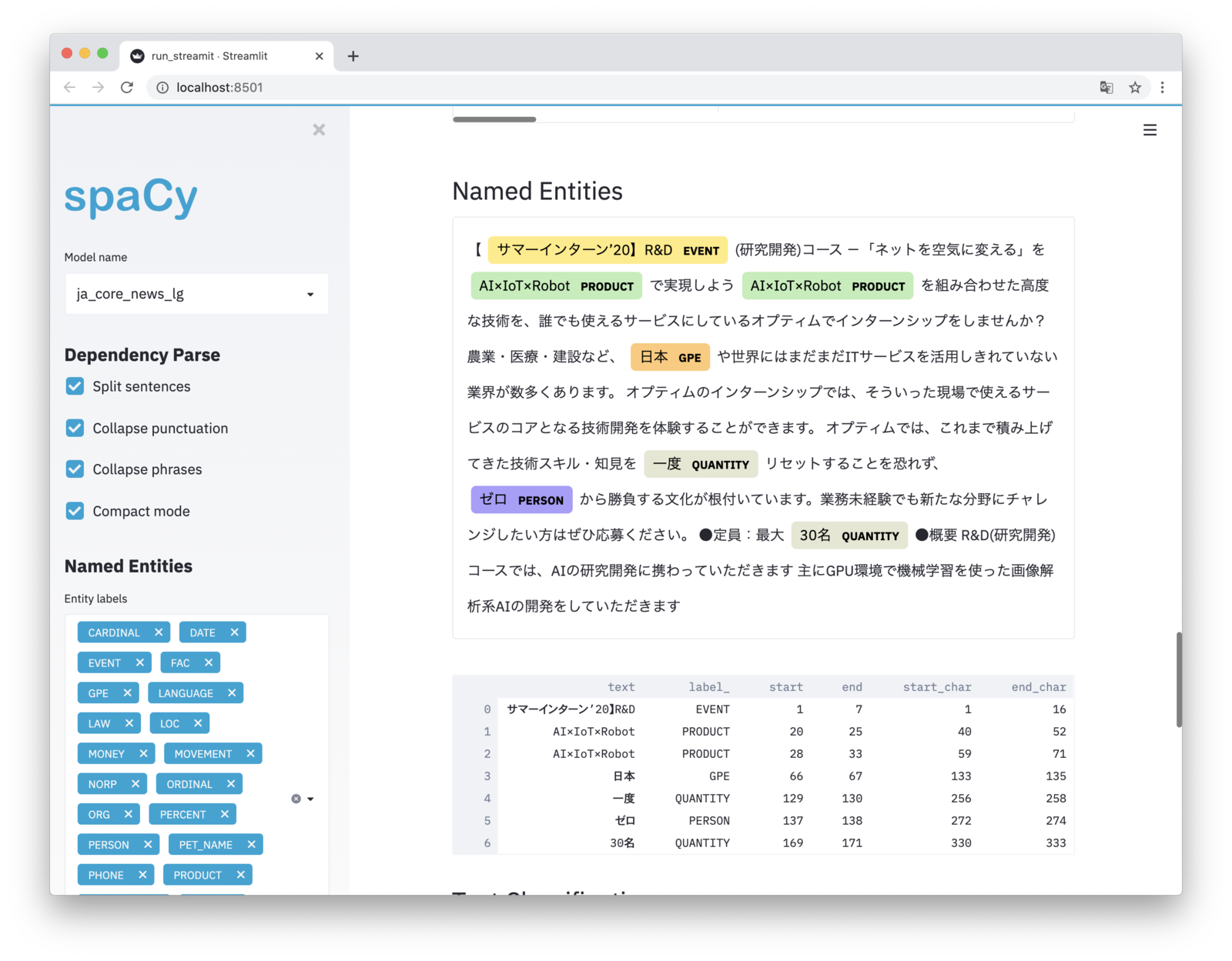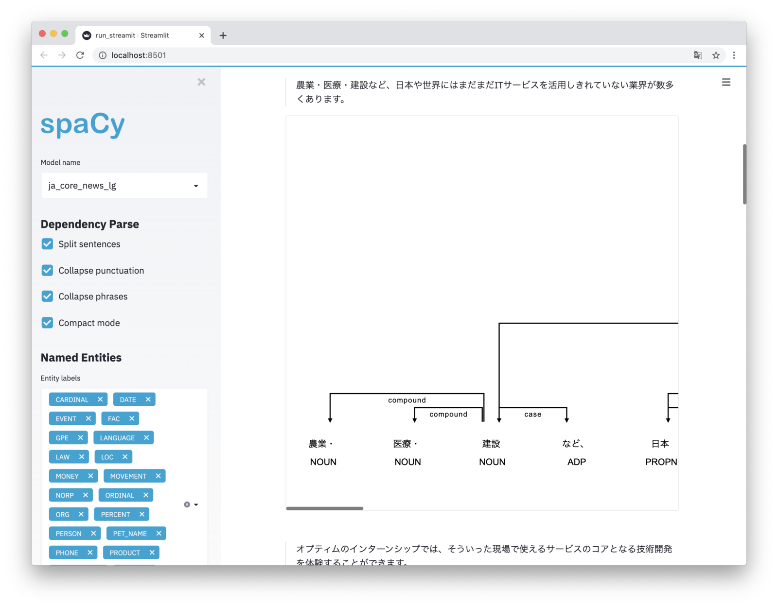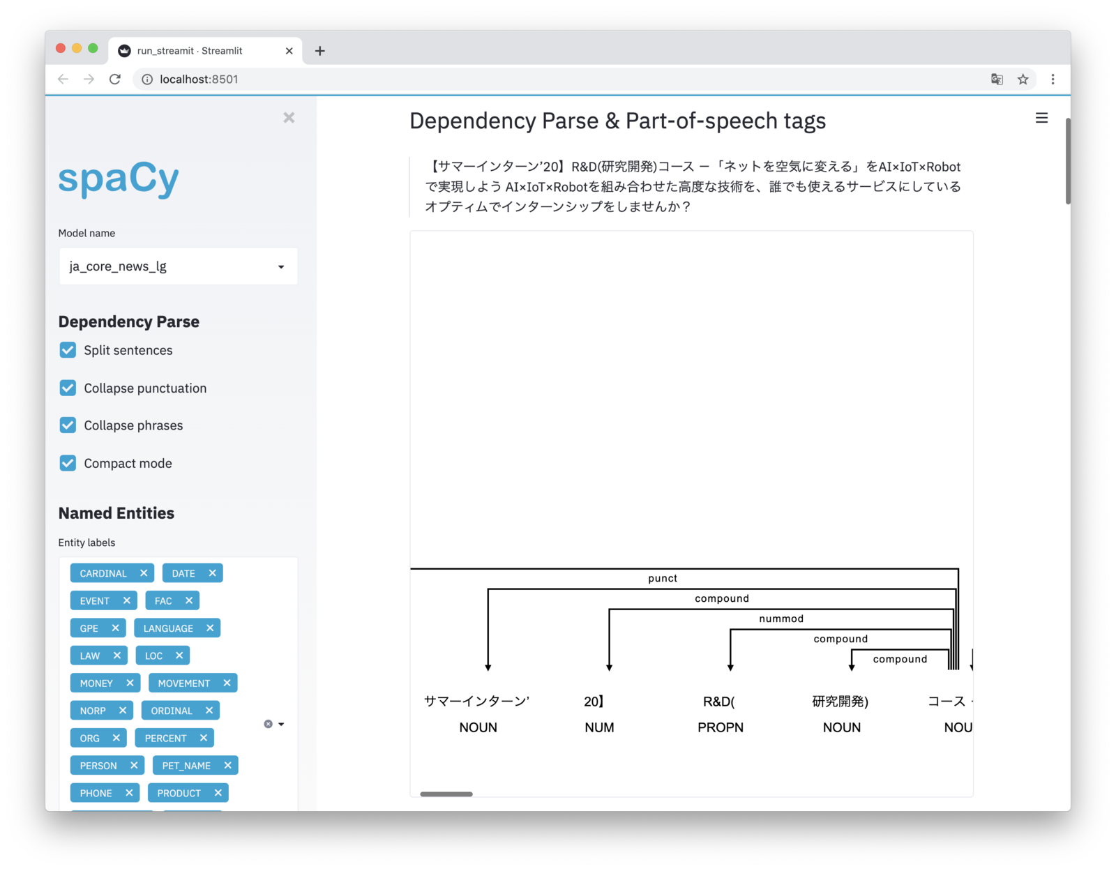 R&D チームの徳田(@dakuton)です。 最近、spaCyの日本語版モデルが正式サポートされたのでいろいろ触ってみたところ、解析結果ビジュアライズを全部まとめるStreamlitアプリも同じ月に提供されていることがわかったので、今回はそちらを紹介します。 なお、ビジュアライズ機能の一部(係り受け解析)は1年前の記事「その他」で紹介しています。