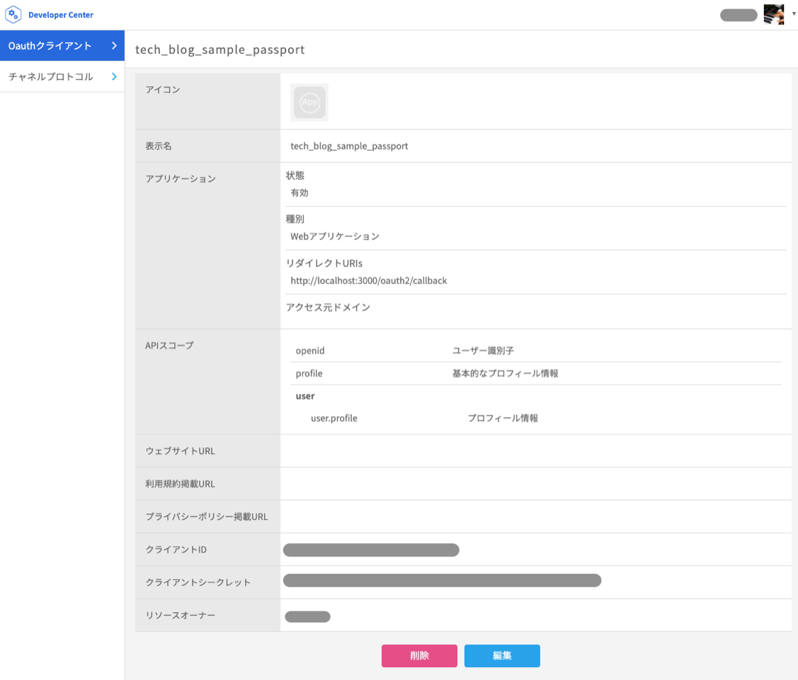 | クライアントシークレット | 非公開 | 認証・認可フローに利用するシークレット |