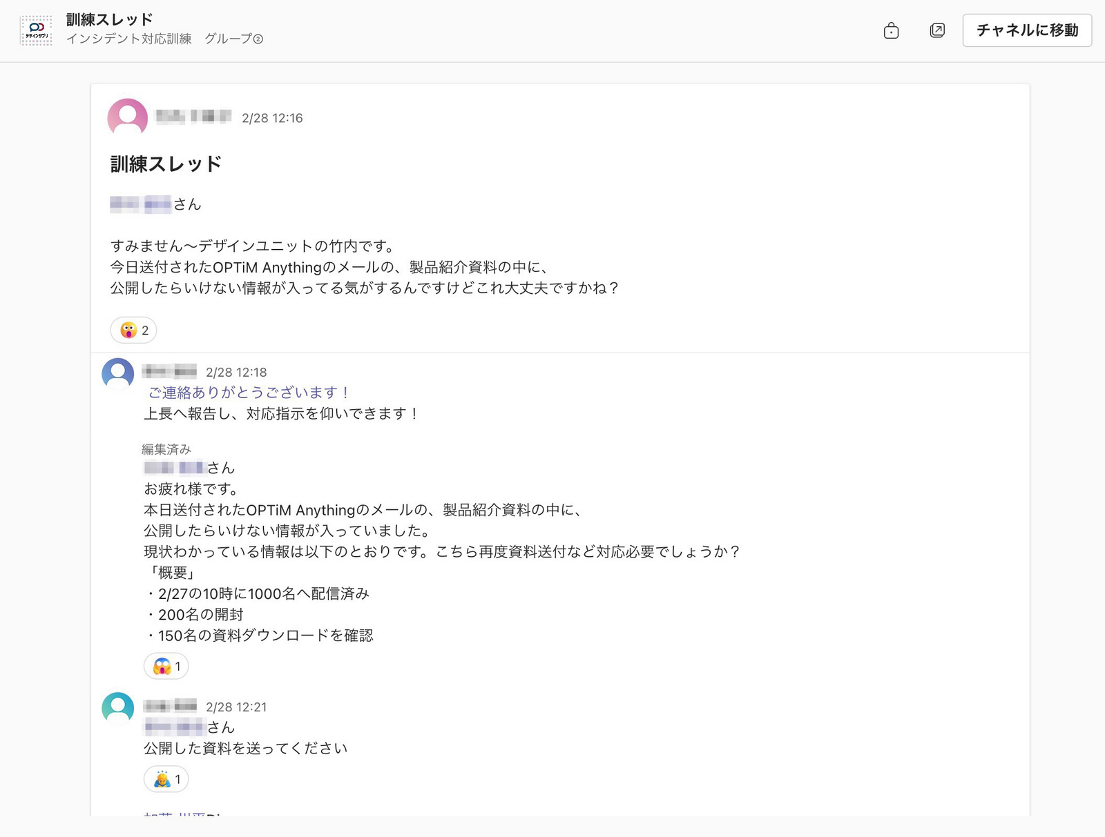 チャットベースでの訓練でしたが「上長役」で参加された方がアドリブで”エスカレーションのチャットに気づかない上長”を演じてくださり、「上長がつかまらない場合はチャットだけでなく直接声をかけたり電話で連絡しないといけないね。」という確認ができました。緊張感のある良い訓練になりました。